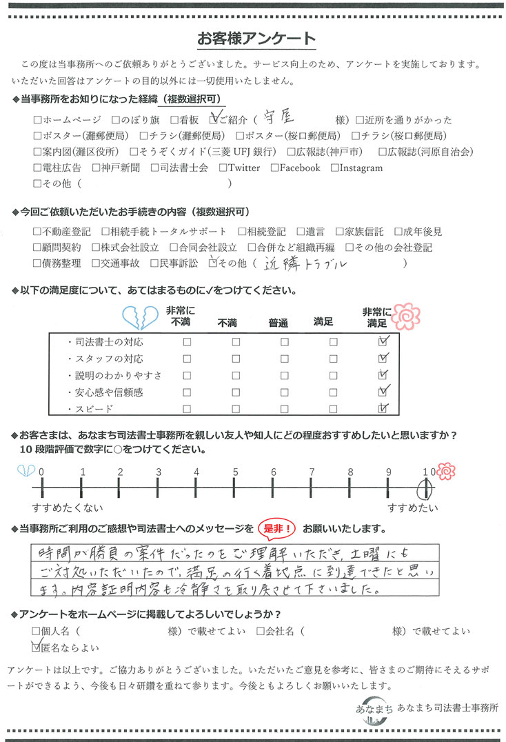 南先生 父親が相続した土地にとても古い根抵当権が付いていて、その抹消方法で2年ほど悩んでいました。今回、南先生にお願いすることになってからはあっという間に作業が進み、根抵当権も無事に抹消されました。最初の問い合わせ時点から、質問するといつも丁寧に迅速に的確にお返事くださり、自分でできることは自分でやりたいという願いも聞き入れてくださいました。本当に感謝しています。ありがとうございました。 |