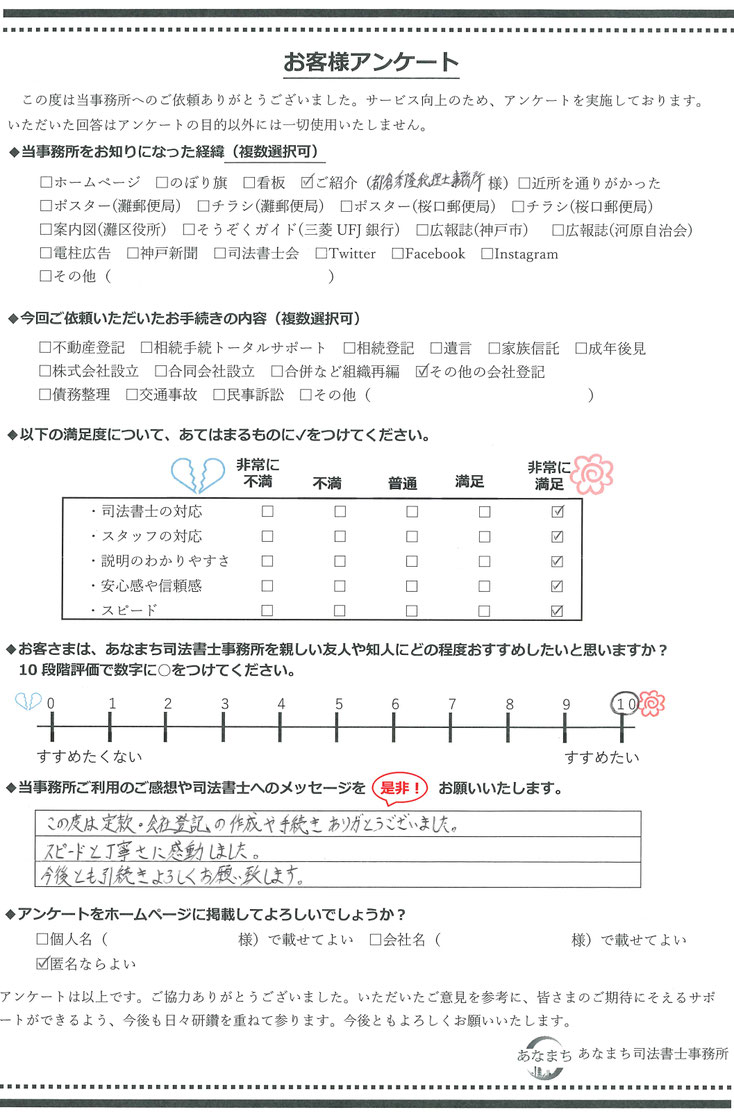 長い社歴の中で、多くの司法書士をご存知だったにもかかわらず、私たちの事務所を思い出していただき、新社長にご紹介いただき、大変光栄でした。今後とも宜しくお願いいたします。