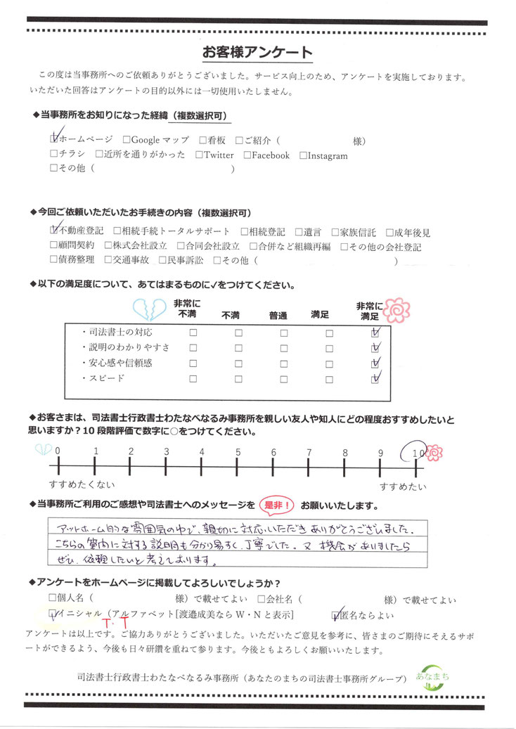 生前対策で不動産登記をさせていただきました。ご家族皆さまがご満足いただけるお手伝いができて大変光栄です。またお気軽にご相談ください。